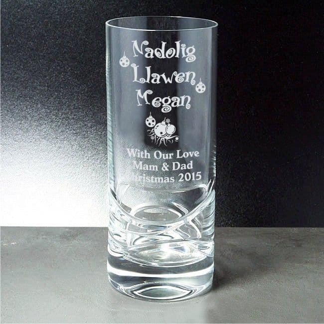 A Crystal Glass High-Ball Tumbler with elegant contemporary styling featuring a deep cut swirl design, engraved with our Nadolig Llawen design and personalised with your own message. All engraving will be in the fonts and styles as shown in the photo.